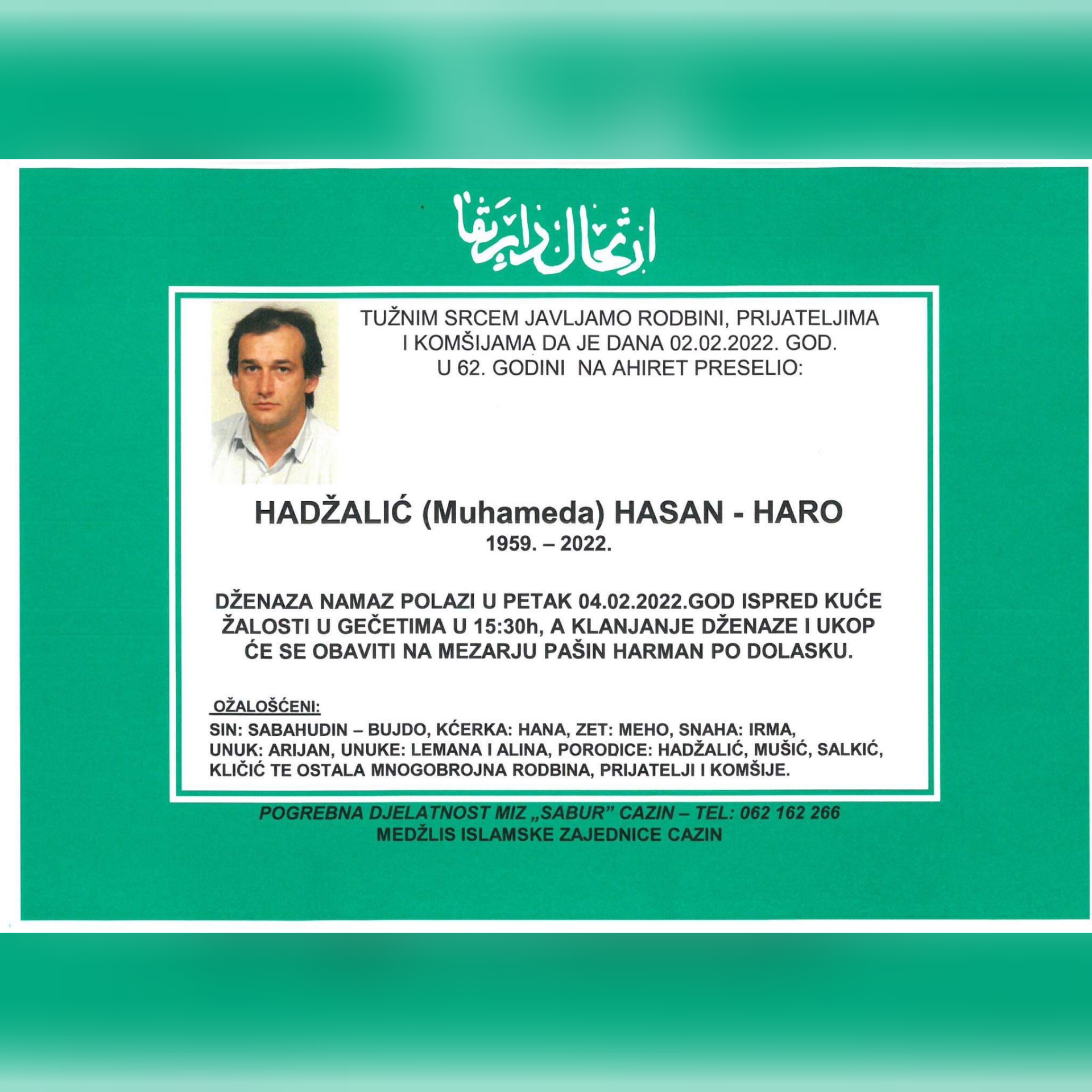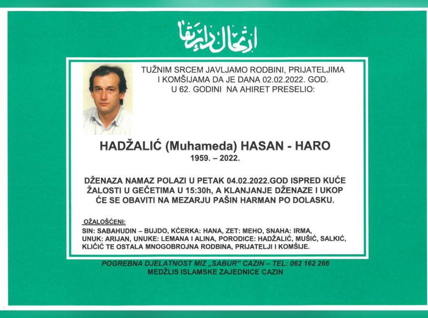 Tužnog srca i s bolom u duši obavještavamo rodbinu, komšije i prijatelje da je naš dragi Hadžalić (Muhameda) Hasan- Haro 02.02.2022. u 62. godini života preselio na ahiret.