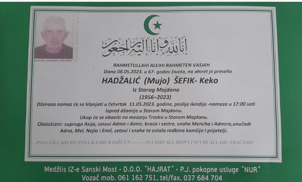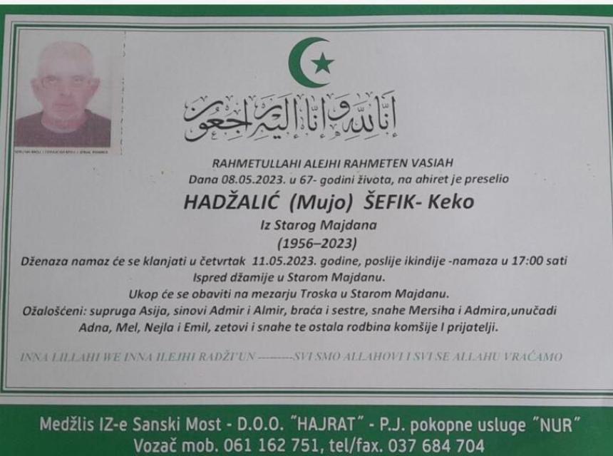 Dženaza će se klanjati u četvrtak 11.05.2023 godine poslije ikindije namaza u 17:00 sati ispred džamije u starom Majdanu