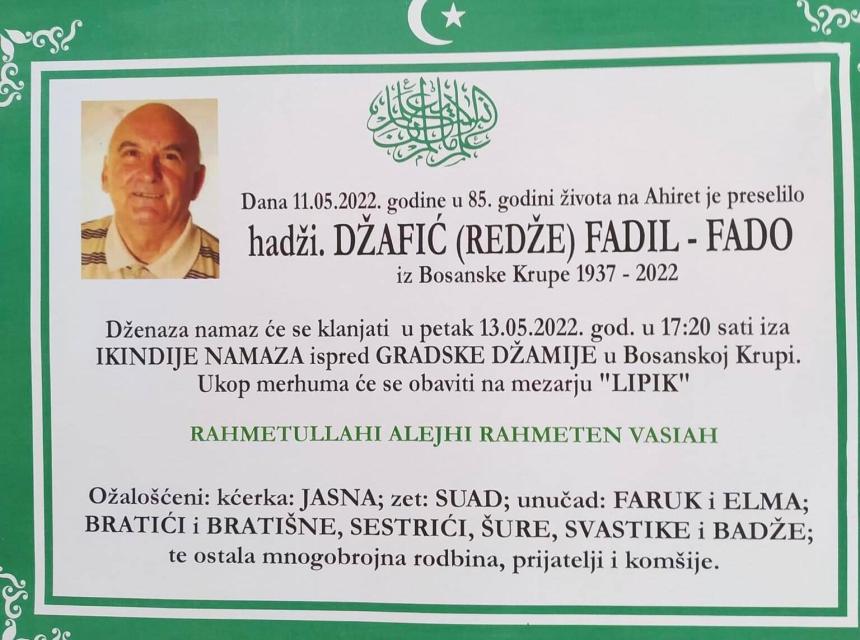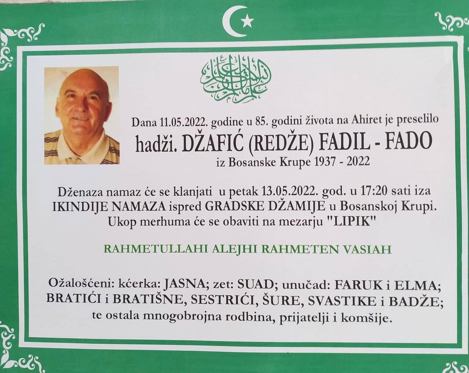 Tužnog srca i s bolom u duši obavještavamo rodbinu, komšije i prijatelje da je naš dragi hadži. Džafić (Redže) Fadil-Fado u 85. godini života preselio na Ahiret.