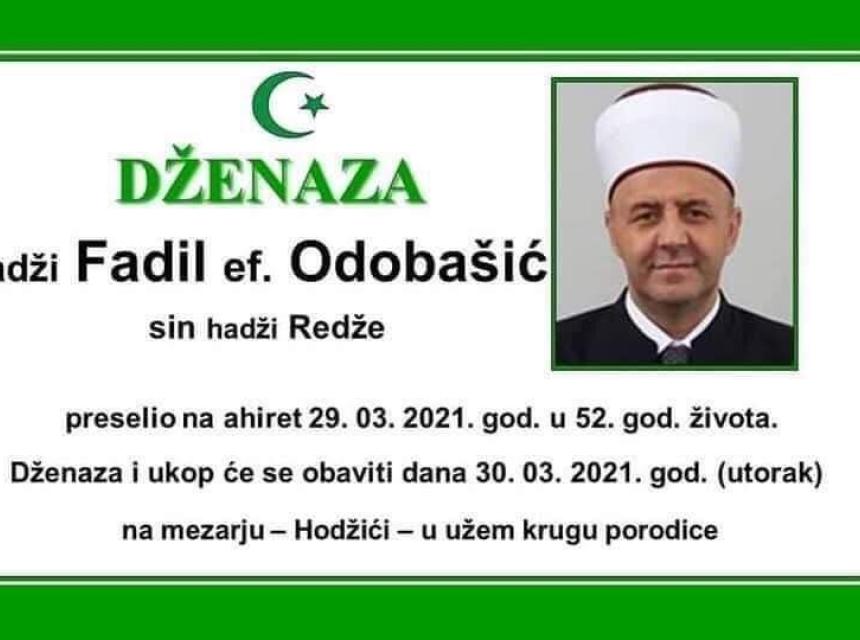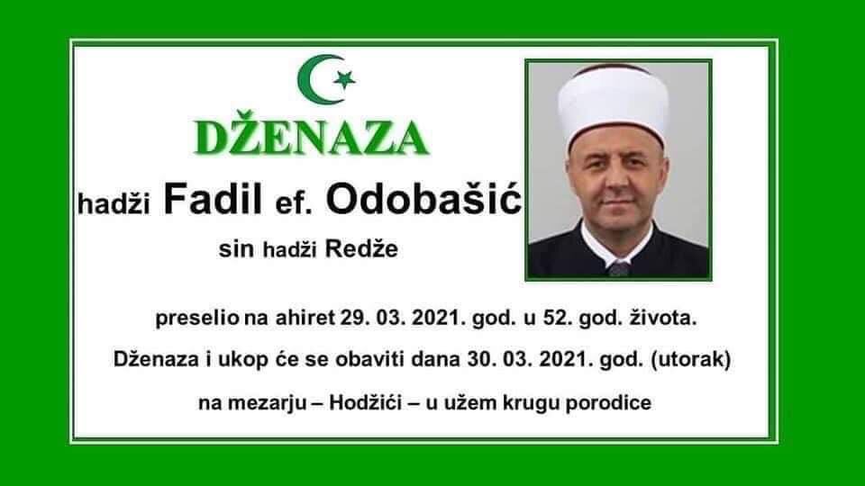 Tužnog srca i s bolom u duši obavještavamo rodbinu, komšije i prijatelje da je naš dragi hadži Fadil ef. Odobašić sin hadži Redže, 29.03.2021. godine, u 52. godini života preselio na Ahiret.