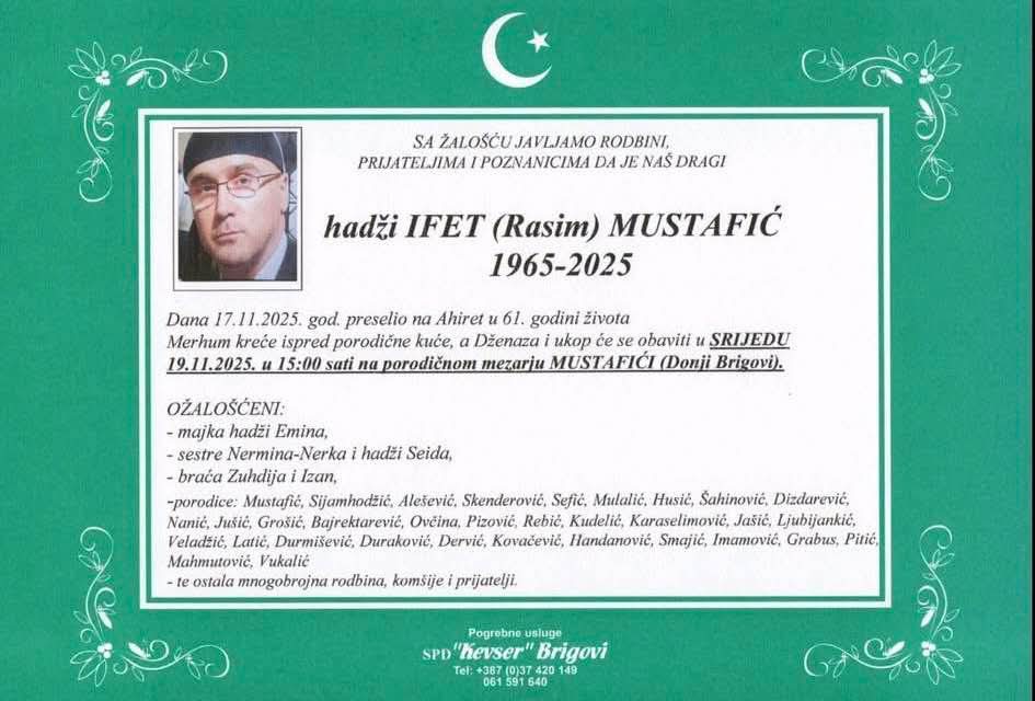 Merhum kreće ispred porodične kuće, a dženaza i ukop će se obaviti u srijedu, 19.11.2025. godine u 15:00 sati na porodičnom mezarju Mustafići (Donji Brigovi).