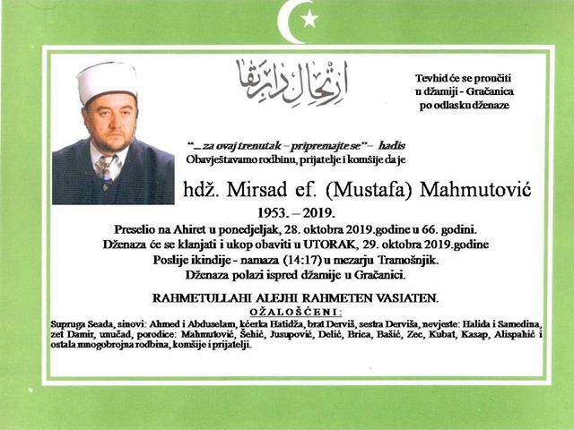 Sa žalošću javljamo rodbini, prijateljima i poznanicima da je naš dragi hadži Mirsad ef. Mahmutović preselio na Ahiret dana 28.10.2019. godine u svojoj 66-oj godini života.