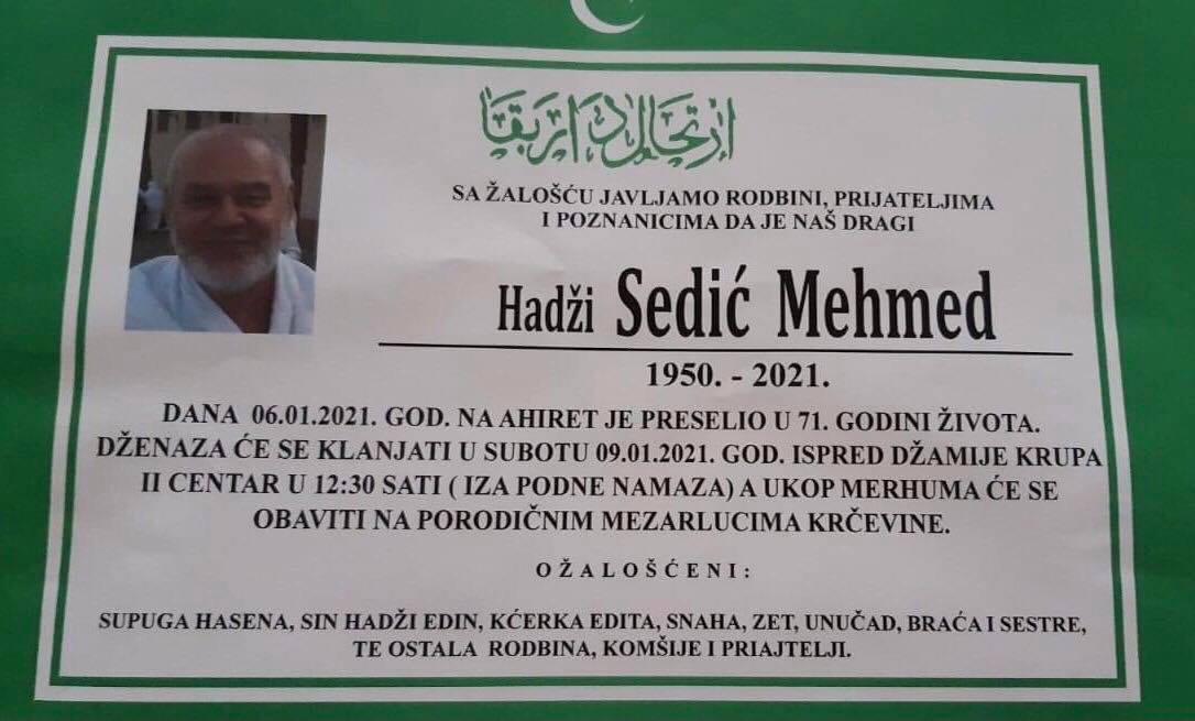 Dženaza namaz obavit će se 09.01.2021. godine (subota) u 12:30 sati (iza podne namaza) ispred džamije Krupa II centar, a ukop merhuma će se obaviti na porodičnim mezarlucima Krčevine.