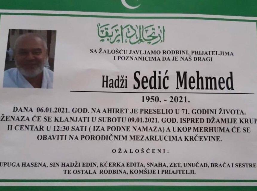 Tužnog srca i s bolom u duši obavještavamo rodbinu, komšije i prijatelje da je naš dragi Hadži Sedić Mehmed 06. januara 2021. godine, u 71. godini života preselio na Ahiret.