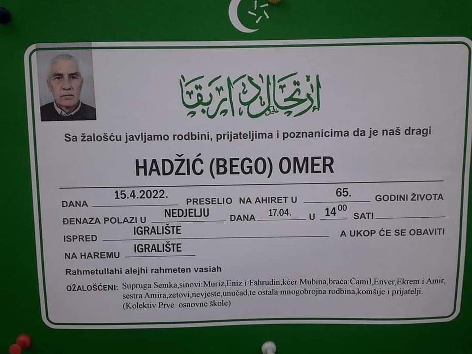 Tužnog srca i s bolom u duši obavještavamo rodbinu, komšije i prijatelje da je naš dragi Hadžić (Bego) Omer u 65. godini života preselio na Ahiret.