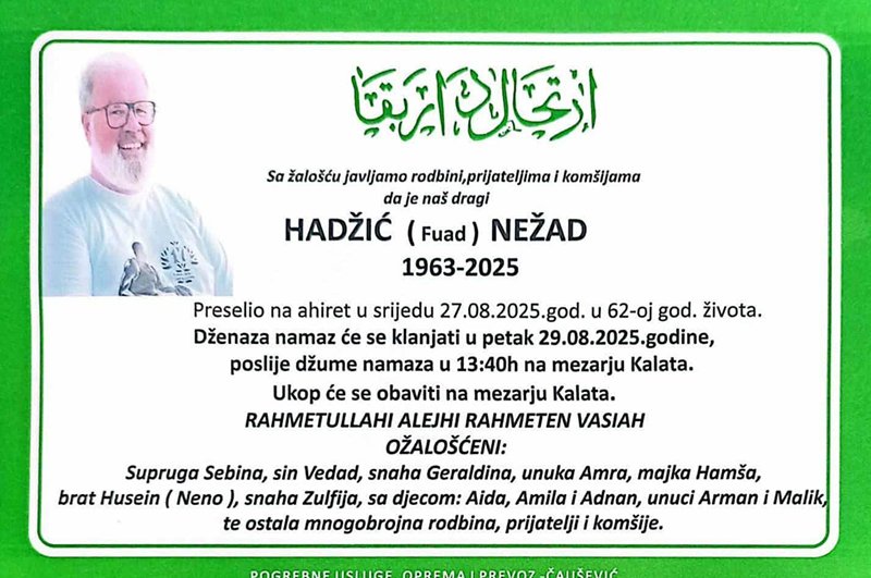 Dženaza namaz će se klanjati u petak 29.08.2025. godine, poslije džume namaza u 13:40h na mezarju Kalata.