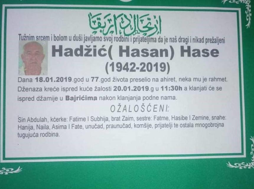 Javljamo rodbini, prijateljima, komšijama i poznanicima da je 18.01.2019. godine u 77. godini života na Ahiret preselio Hadžić (Hasan) Hase.