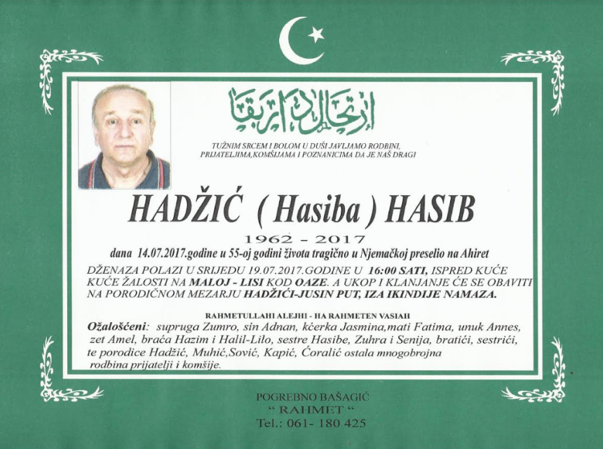 Tužnim srcem i bolom u duši javljamo rodbini, prijateljima, komšijama i poznanicima da je naš dragi Hadžić (Hasiba) Hasib dana 14.07.2017.godine u 55-oj godini života tragično u Njemačkoj preselio na Ahiret.