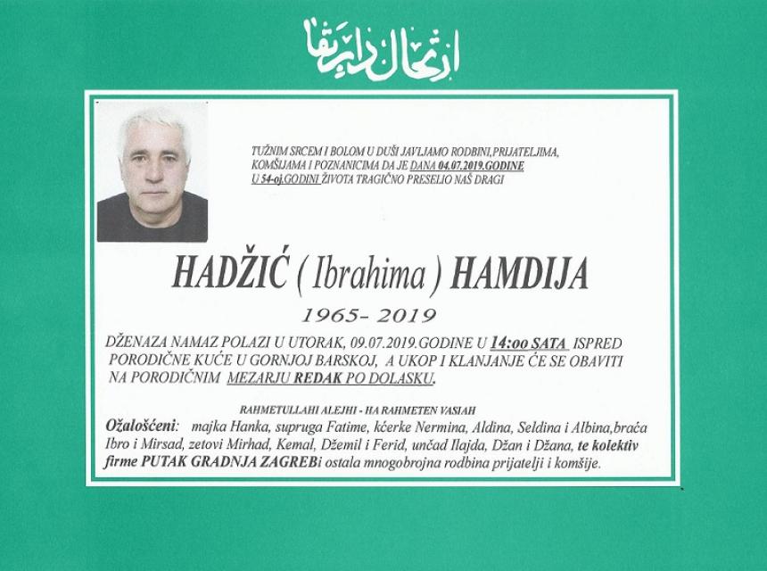 Tužnim srcem i bolom u duši, javljamo rodbini, prijateljima, komšijama i poznanicima da je dana 04.07.2019 god. u 54. godini života tragično preselio na Ahiret naš dragi Hadžić (Ibrahima) Hamdija.