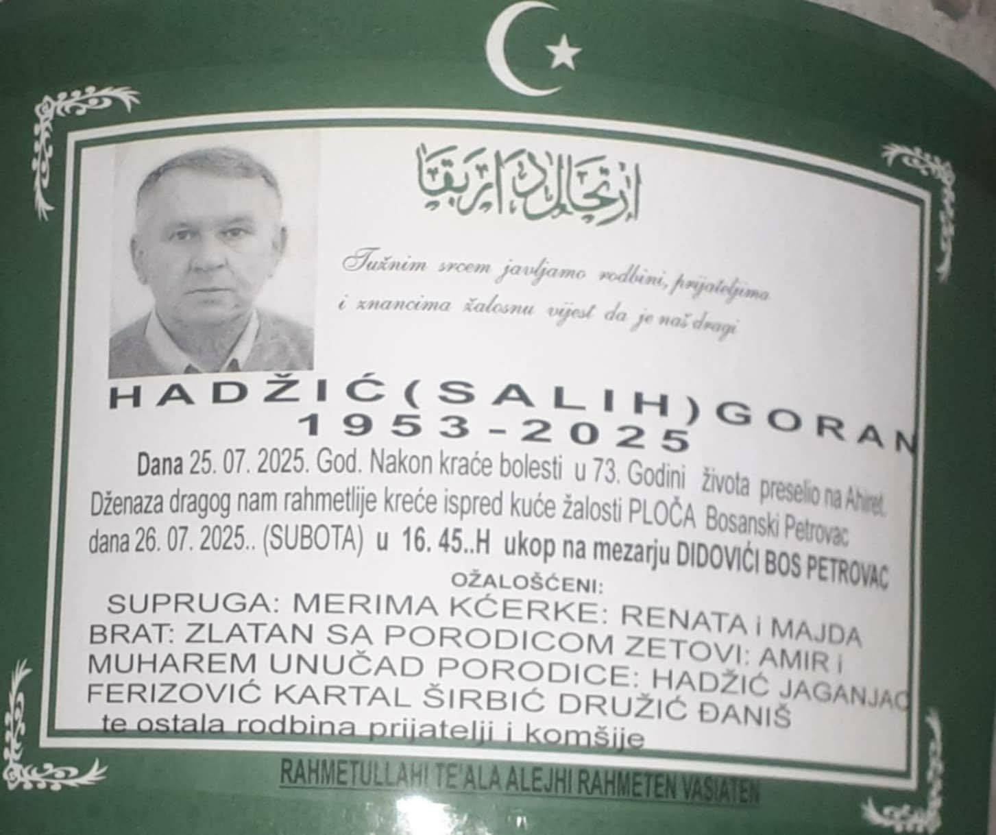 Tužnim srcem i bolom u duši javljamo rodbini, prijateljima i komšijama da je naš dragi Hadžić (Salih) Goran, dana 25.07.2025. godine u 73-oj godini života, preselio na Ahiret.