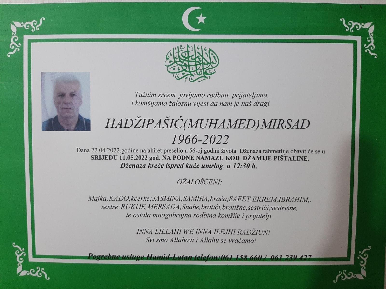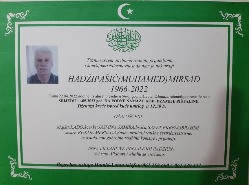 Tužnog srca i s bolom u duši obavještavamo rodbinu, komšije i prijatelje da je naš dragi Hadžipašić (Muhamed) Mirsad u 56. godini života preselio na Ahiret.