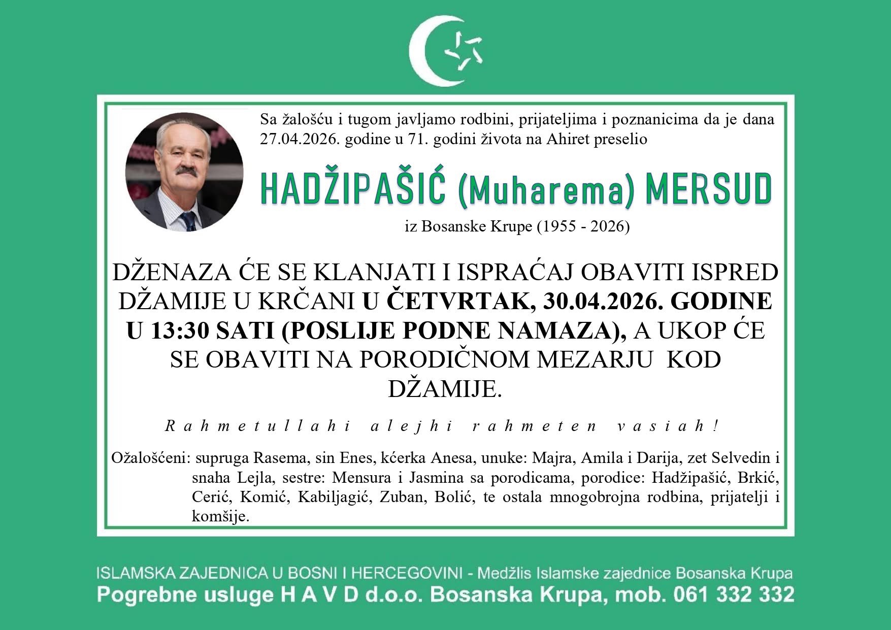 Dženaza će se klanjati i ispraćaj obaviti ispred džamije u Krčani u četvrtak, 30.04.2026. godine u 13:30 sati (poslije podne namaza), a ukop će se obaviti na porodičnom mezarju kod džamije.