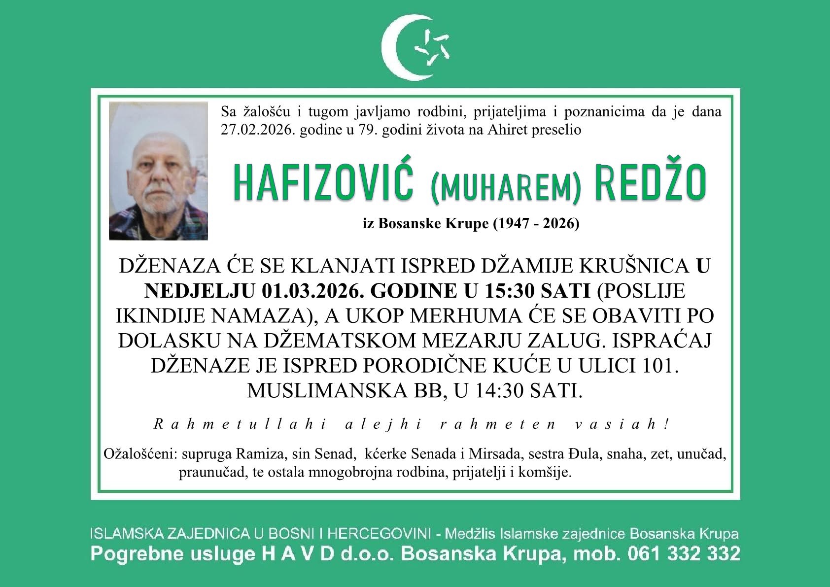 Dženaza će se klanjati ispred džamije Krušnica u nedjelju, 01. 03. 2026. godine u 15:30 sati (poslije ikindije-namaza), a ukop merhuma će se obaviti po dolasku na džematskom mezarju Zalug.