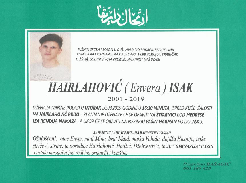 Tužnim srcem i bolom u duši javljamo rodbini, prijateljima i poznanicima da je naš dragi Hairlahović (Envera) Isak, dana 18.08.2019. godine tragično u 19-oj. godini života preselio na Ahiret.