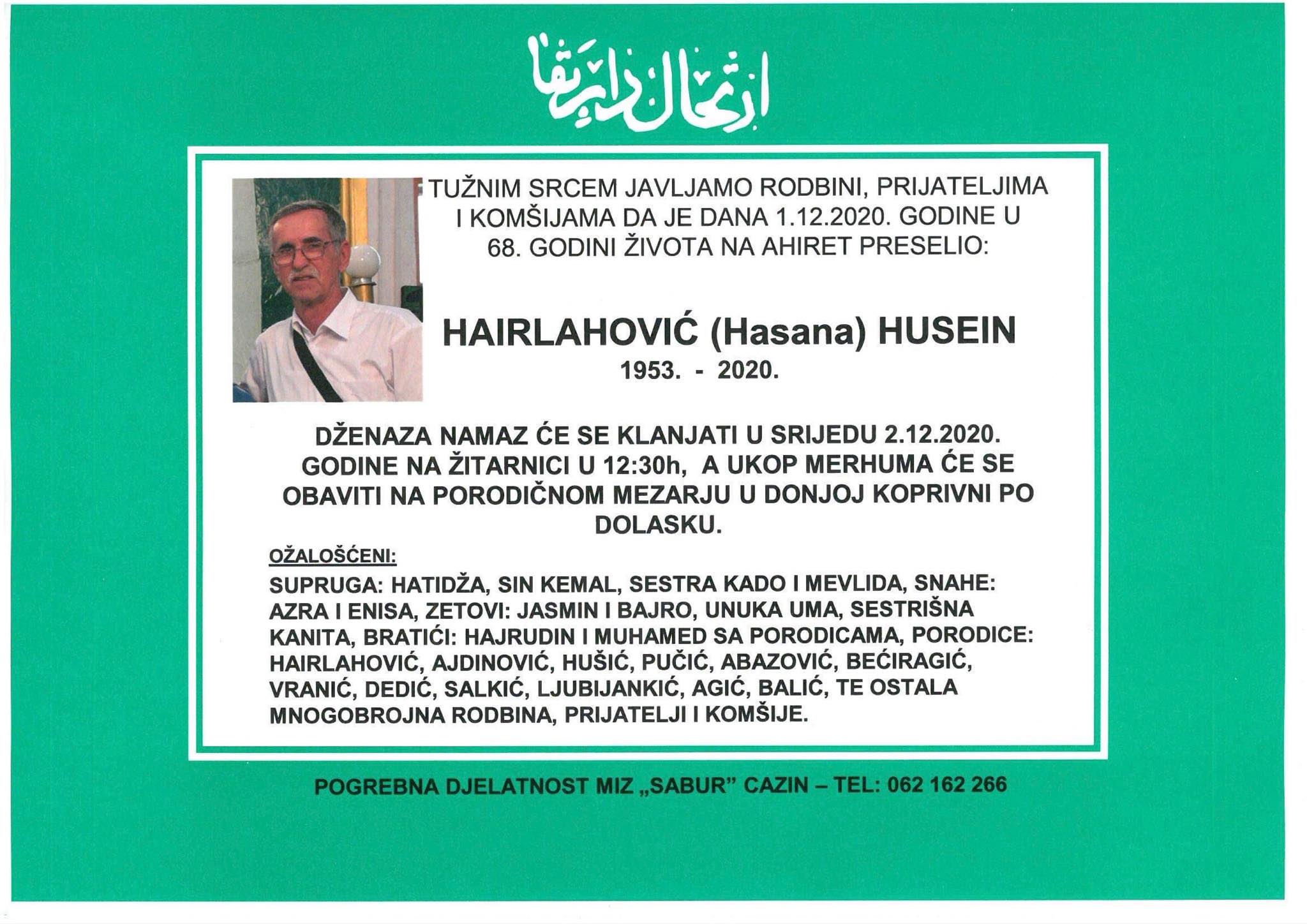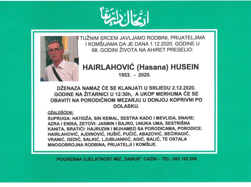 Tužnog srca i s bolom u duši obavještavamo rodbinu, komšije i prijatelje da je naš dragi Hairlahović (Hasana) Husein preselio na Ahiret dana 01. decembra 2020. godine u 68. godini života.