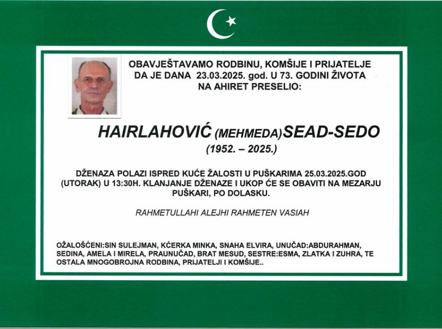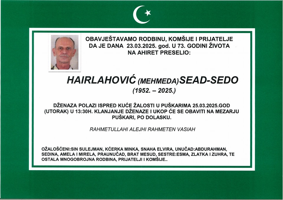 Tužnim srcem javljamo rodbini, prijateljima i poznanicima žalosnu vijest da nam je naš dragi Hairlahović (Mehmeda) Sead – Sedo 23.03.2025. godine na ahiret preselio u 73-oj godini života.