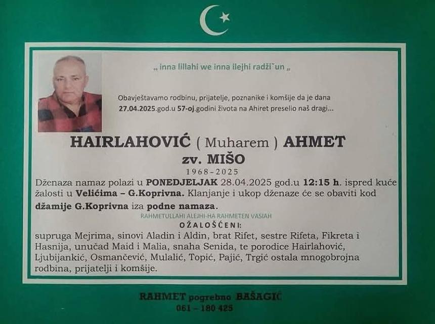 Dženaza namaz polazi u ponedjeljak 28.04.2025. godine u 12:15 sati ispred kuće žalosti u Velićima - G. Koprivna.