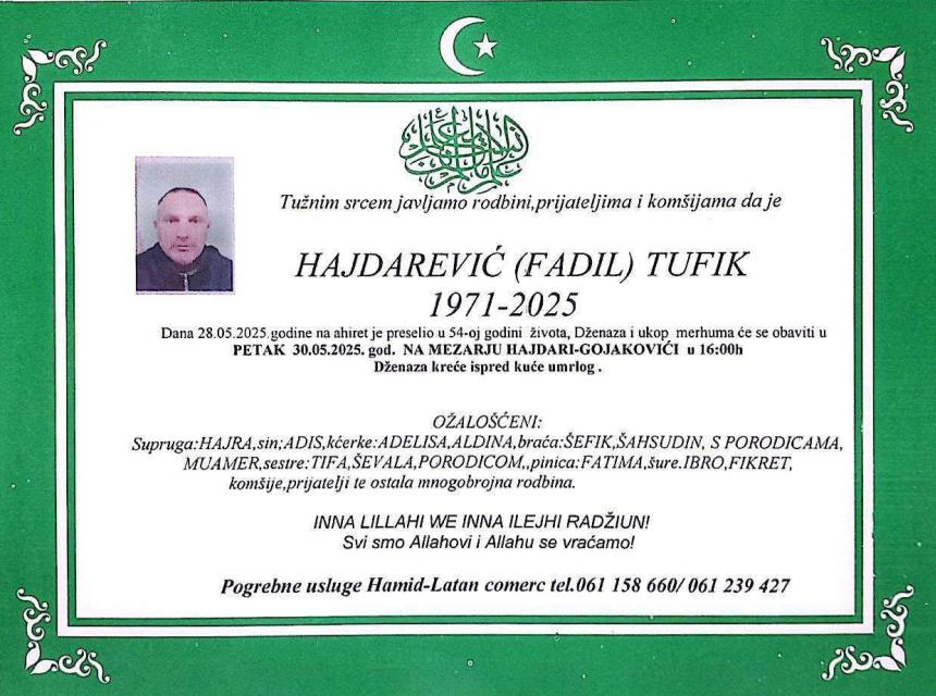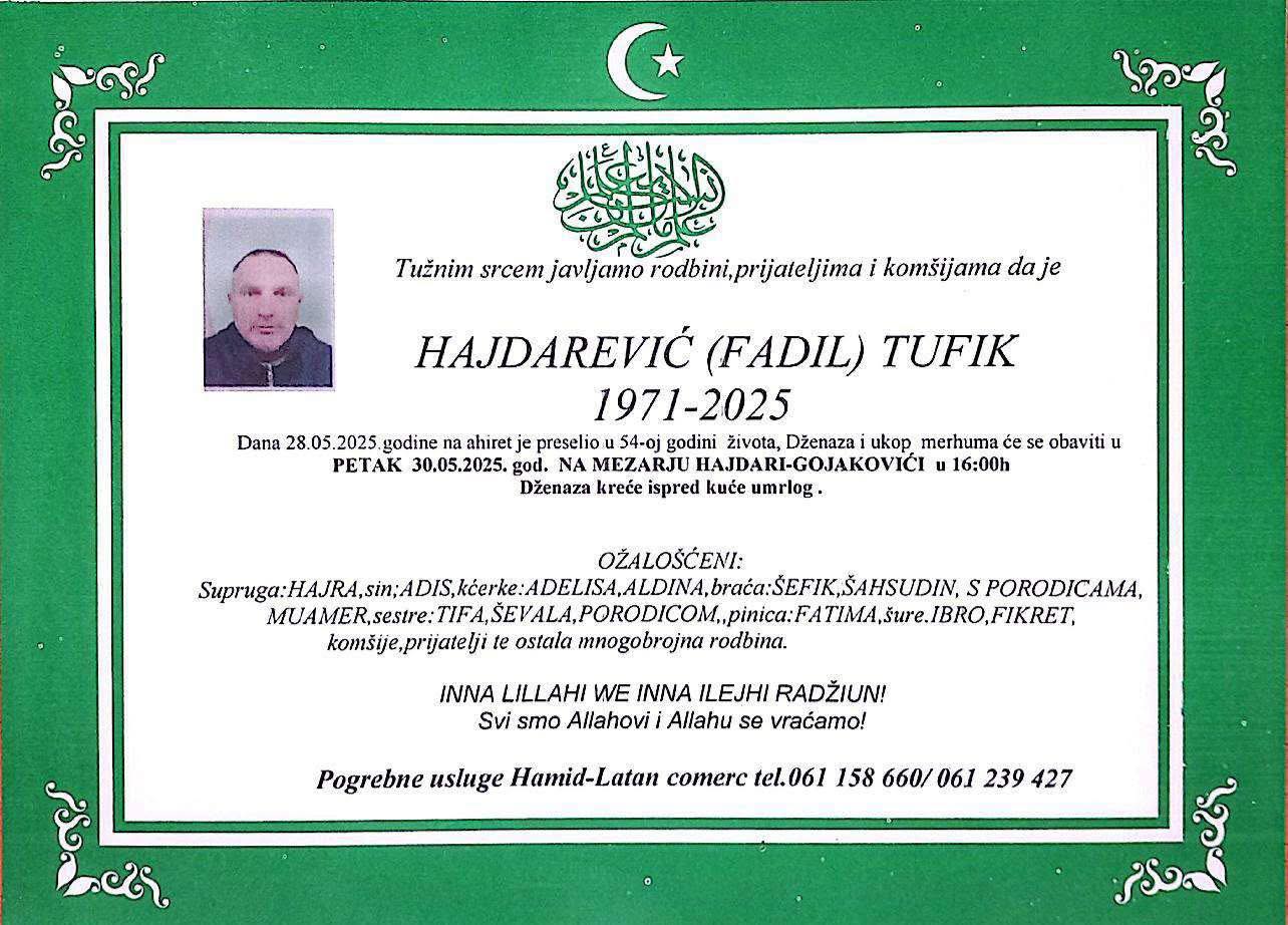 Obavještavamo rodbinu i prijatelje da je 28.05.2025. godine na Ahiret u 54. godini života preselio HAJDAREVIĆ (Fadil) TUFIK.