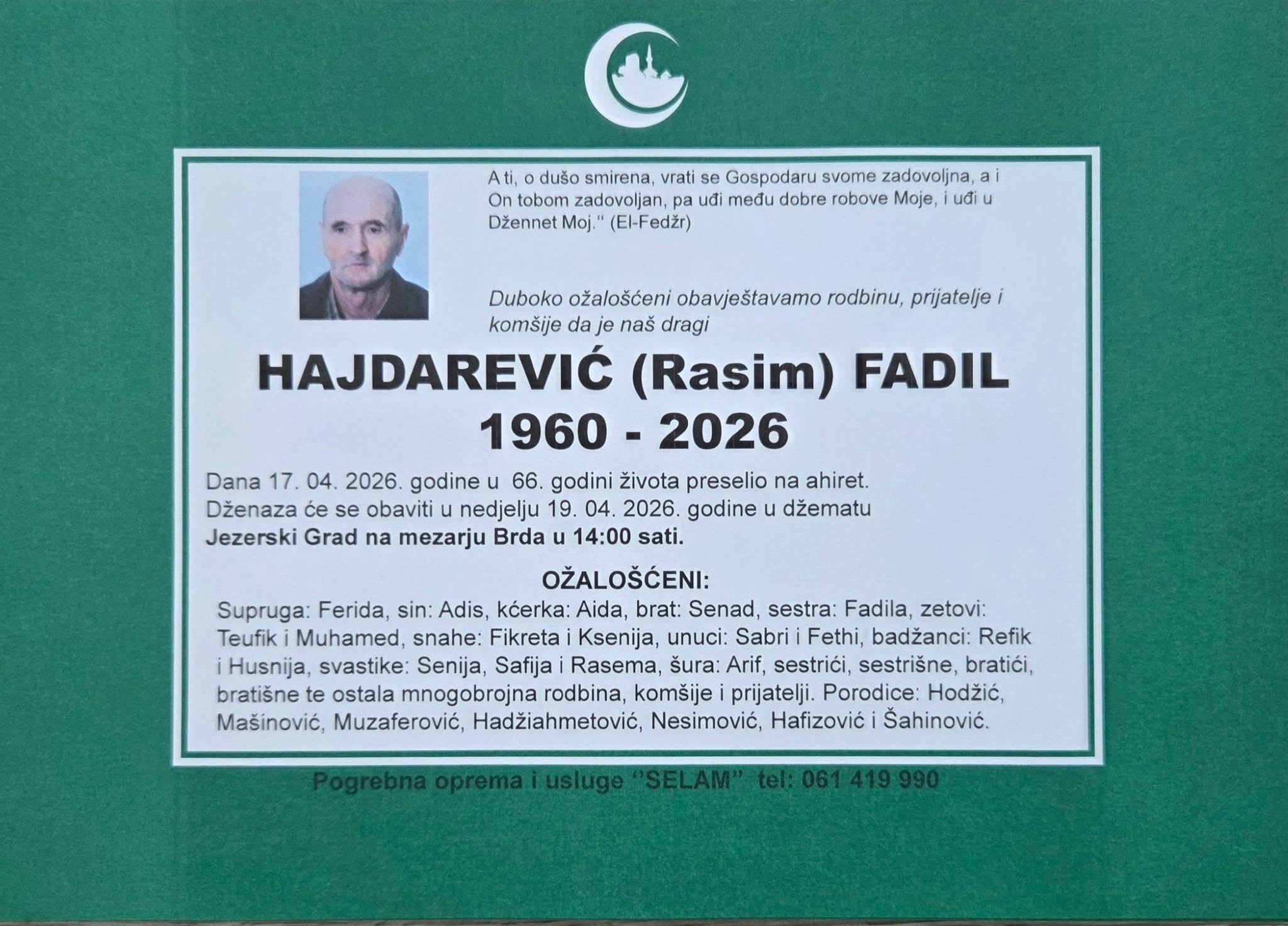 Dženaza će se obaviti u nedjelju, 19. 4. 2026. godine, u džematu Jezerski Grad, na mezarju Brda, u 14:00 sati.