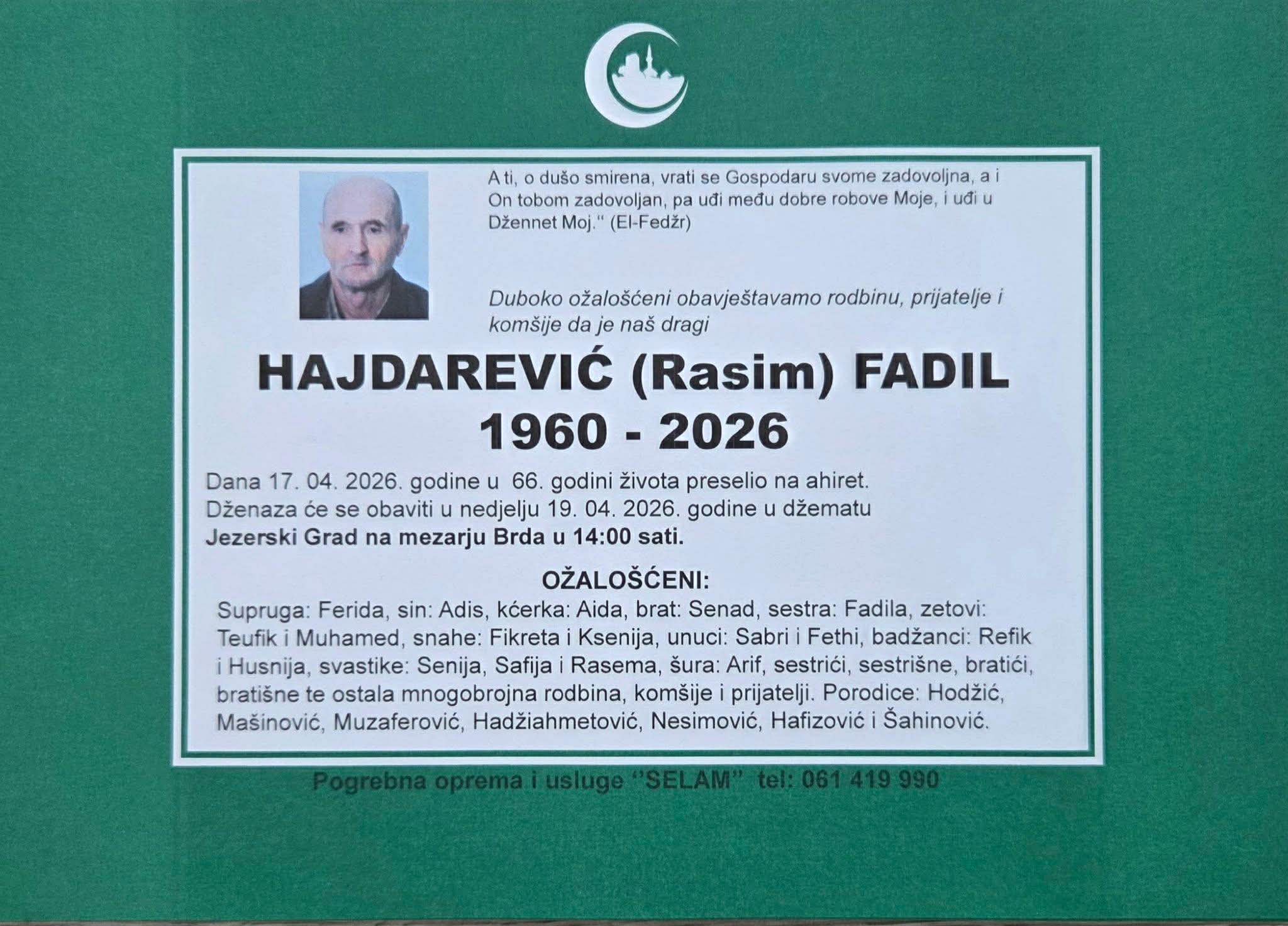 Dženaza će se obaviti u nedjelju 19. 04. 2026. godine u džematu Jezerski Grad na mezarju Brda u 14:00 sati.