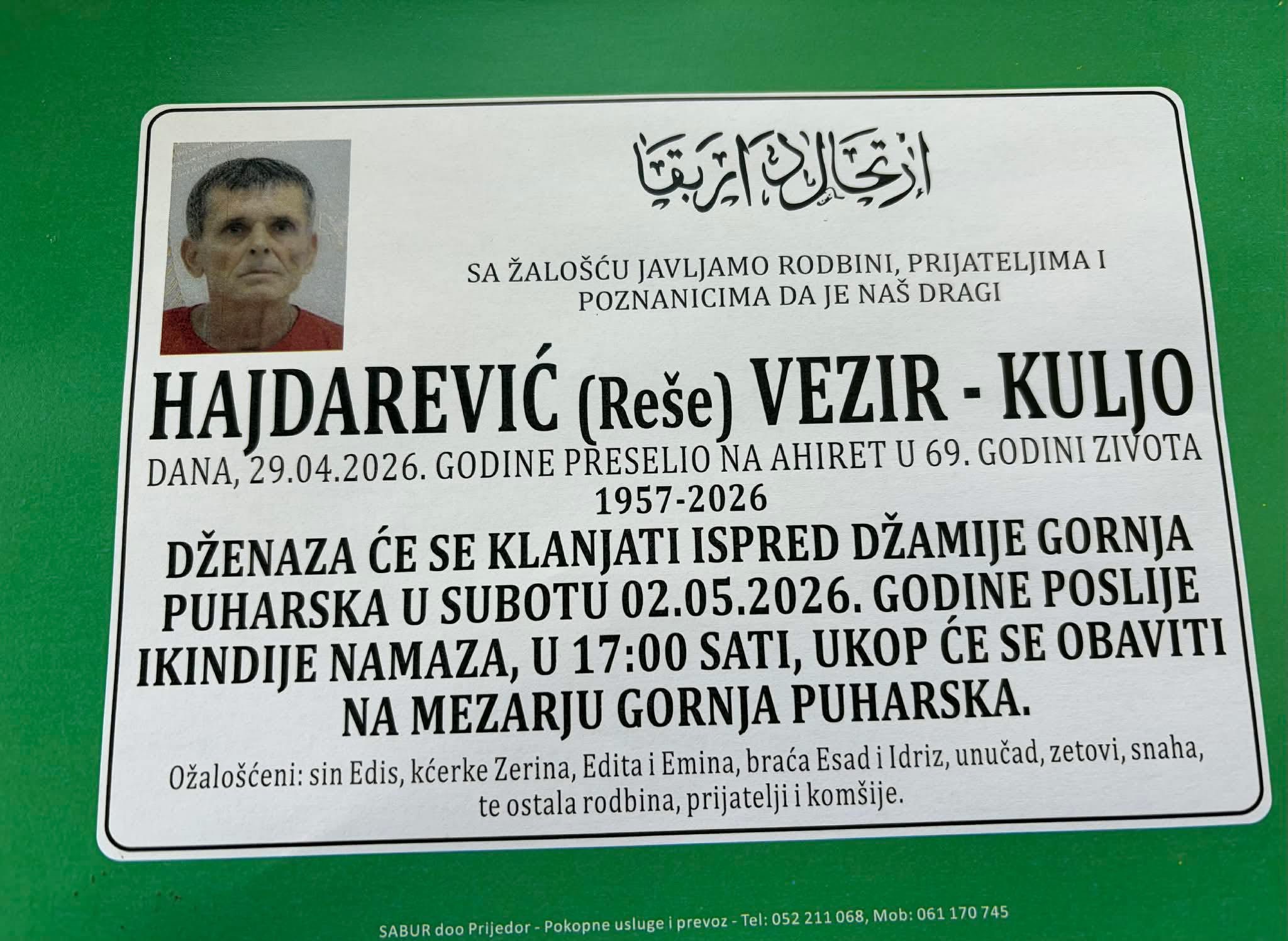 Dženaza će se klanjati ispred džamije Gornja Puharska u subotu 02.05.2026. godine poslije ikindije namaza, u 17:00 sati, a ukop će se obaviti na mezarju Gornja Puharska.