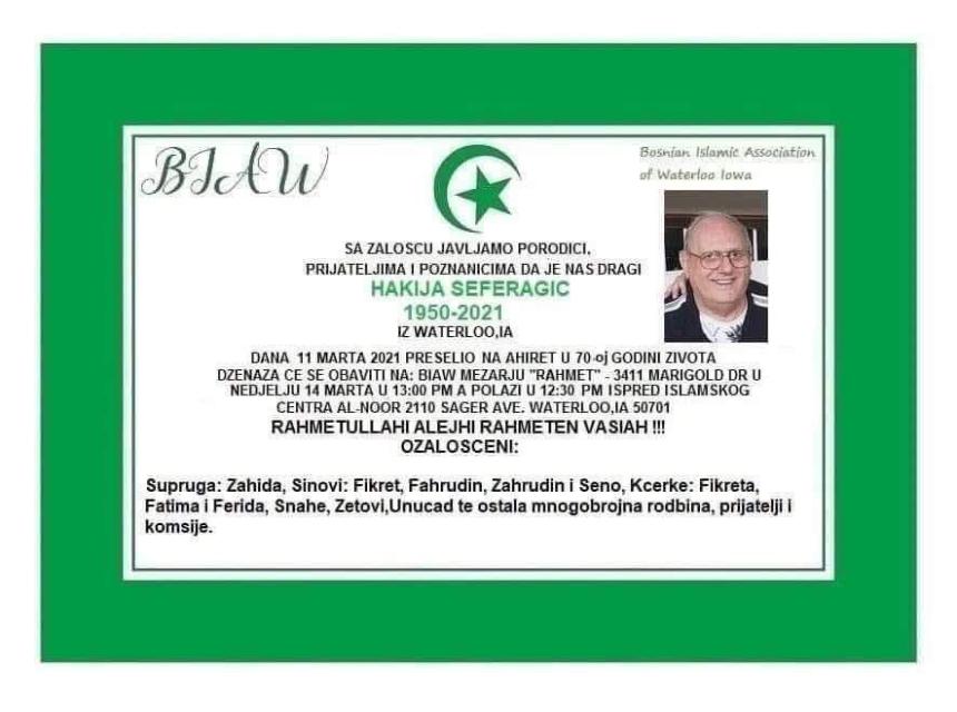Dženaza će se obaviti na Biaw mezarju "Rahmet" - 3411 Marigold DR u nedjelju, 14.03.2021. godine u 13:00h, a polazi ispred Islamskog centra AL-NOOR 2110 SAGER AVE. WATERLOO, IA 50701 u 13:00h.