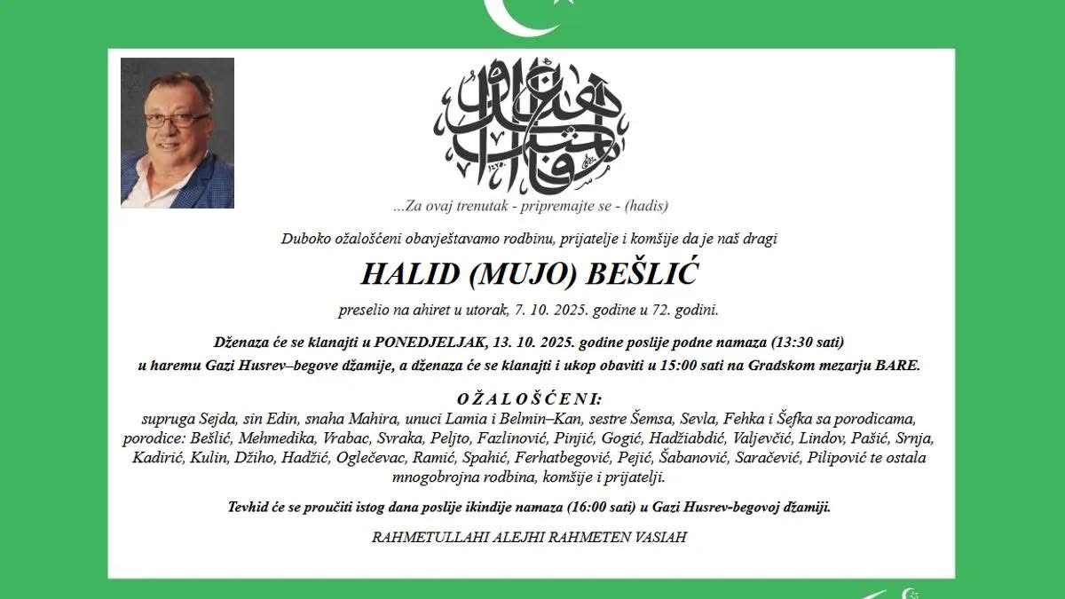 Dženaza će se klanjati u PONEDJELJAK, 13. 10. 2025. godine poslije podne namaza (13:30 sati) u haremu Gazi Husrev-begove džamije, a dženaza će se klanjati i ukop obaviti u 15:00 sati na Gradskom mezarju BARE.