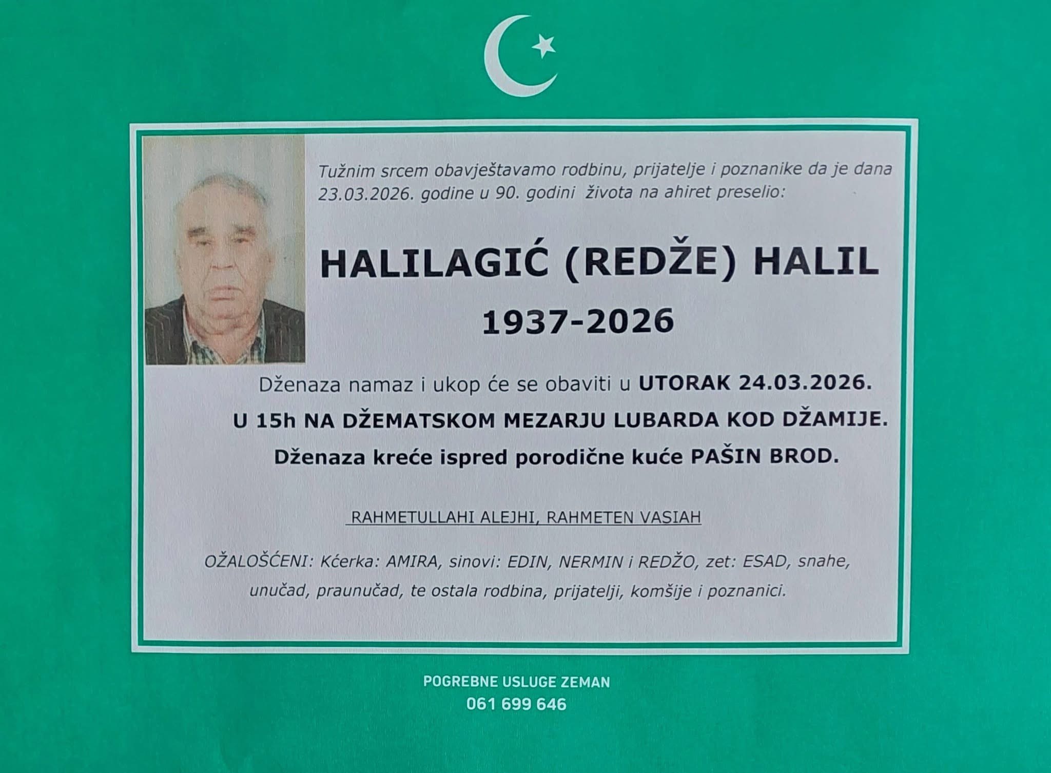 Dženaza-namaz i ukop će se obaviti u utorak, 24.03.2026. godine u 15:00 sati na džematskom mezarju Lubarda kod džamije.