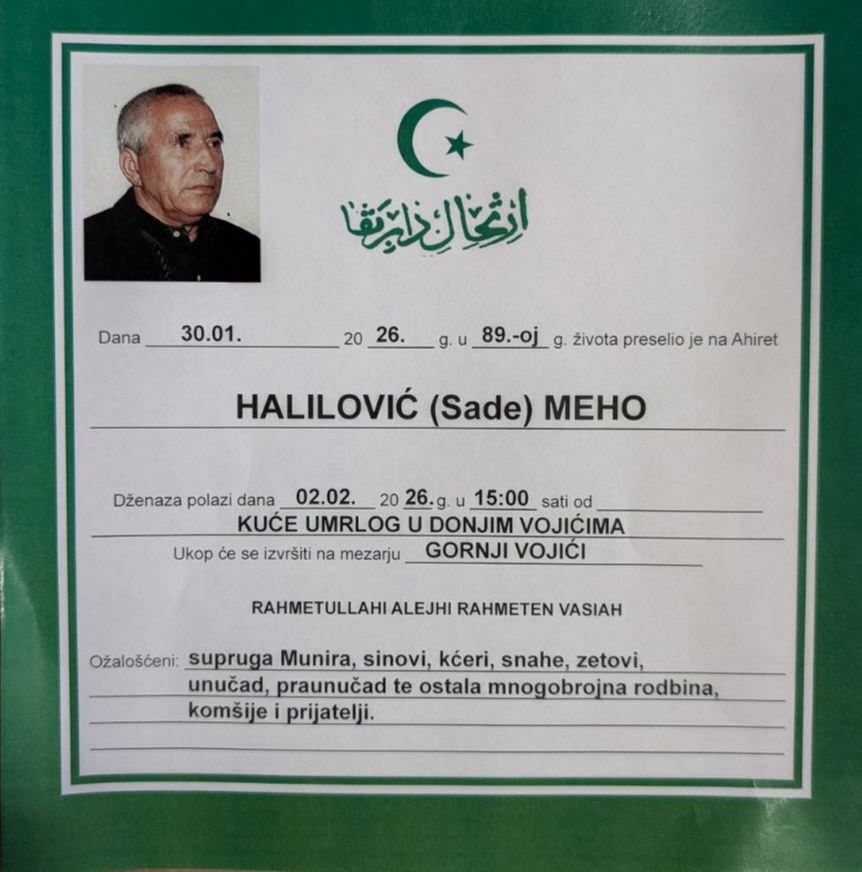 Dženaza polazi dana 02.02. 20 26.g. u 15:00 sati od KUĆE UMRLOG U DONJIM VOJIĆIMA.