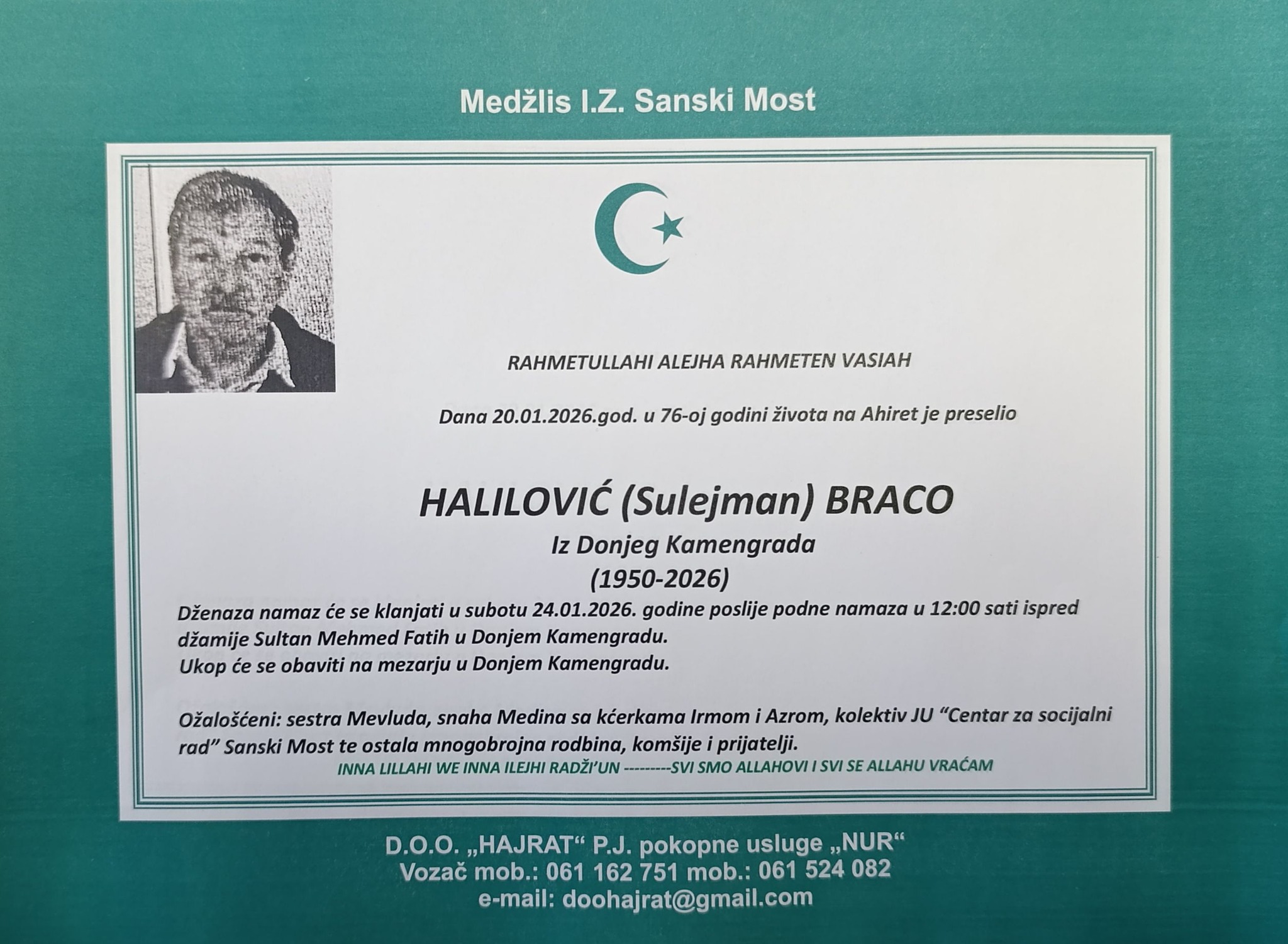 Dženaza namaz će se klanjati u subotu 24.01.2026. godine poslije podne namaza u 12:00 sati ispred džamije Sultan Mehmed Fatih u Donjem Kamengradu.