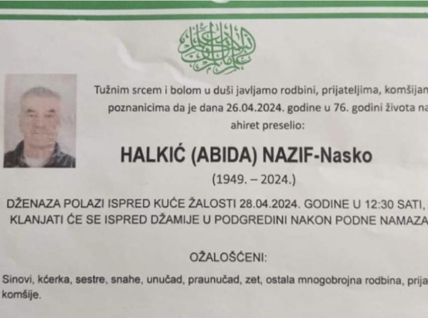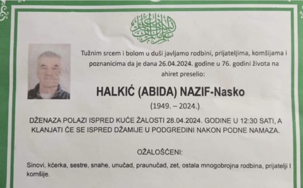 Tužnim srcem javljamo rodbini, prijateljima i znancima žalosnu vijest da je naš dragi Halkić (Abida) Nazif- Nasko dana 26.04.2024. u 76. godini života preselio na Ahiret.