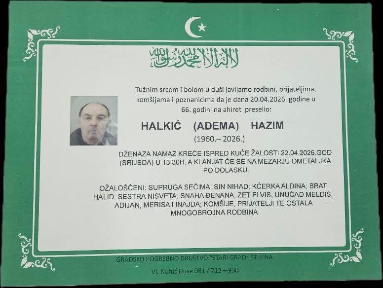 Dženaza-namaz kreće ispred kuće žalosti 22.04.2026. godine (srijeda) u 13:30 sati, a klanjat će se na mezarju Ometaljka po dolasku.