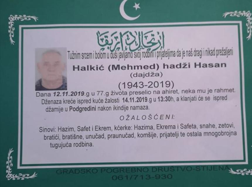 Tužnim srcem i bolom u duši javljamo rodbini i prijateljima da je naš dragi i nikad prežaljeni Halkić (Mehmed) hadži Hasan dana 12.11.2019. g. u 77. g. života preselio na Ahiret, neka mu je rahmet.