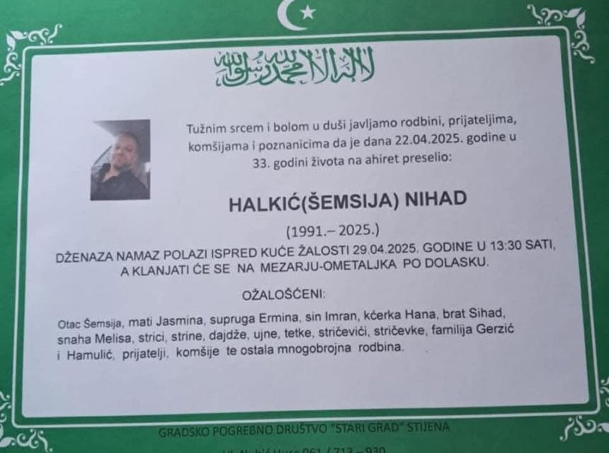 Tužnim srcem i bolom u duši javljamo rodbini, prijateljima, komšijama i poznanicima da je dana 22.04.2025. godine u 33. godini života na ahiret preselio: