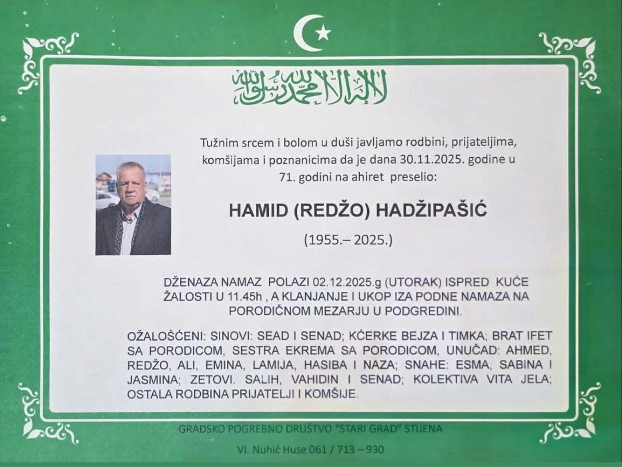 Dženaza namaz polazi 02.12.2025. godine (utorak) ispred kuće žalosti u 11:45 sati, a klanjanje i ukop iza podne-namaza na porodičnom mezarju u Podgredini.
