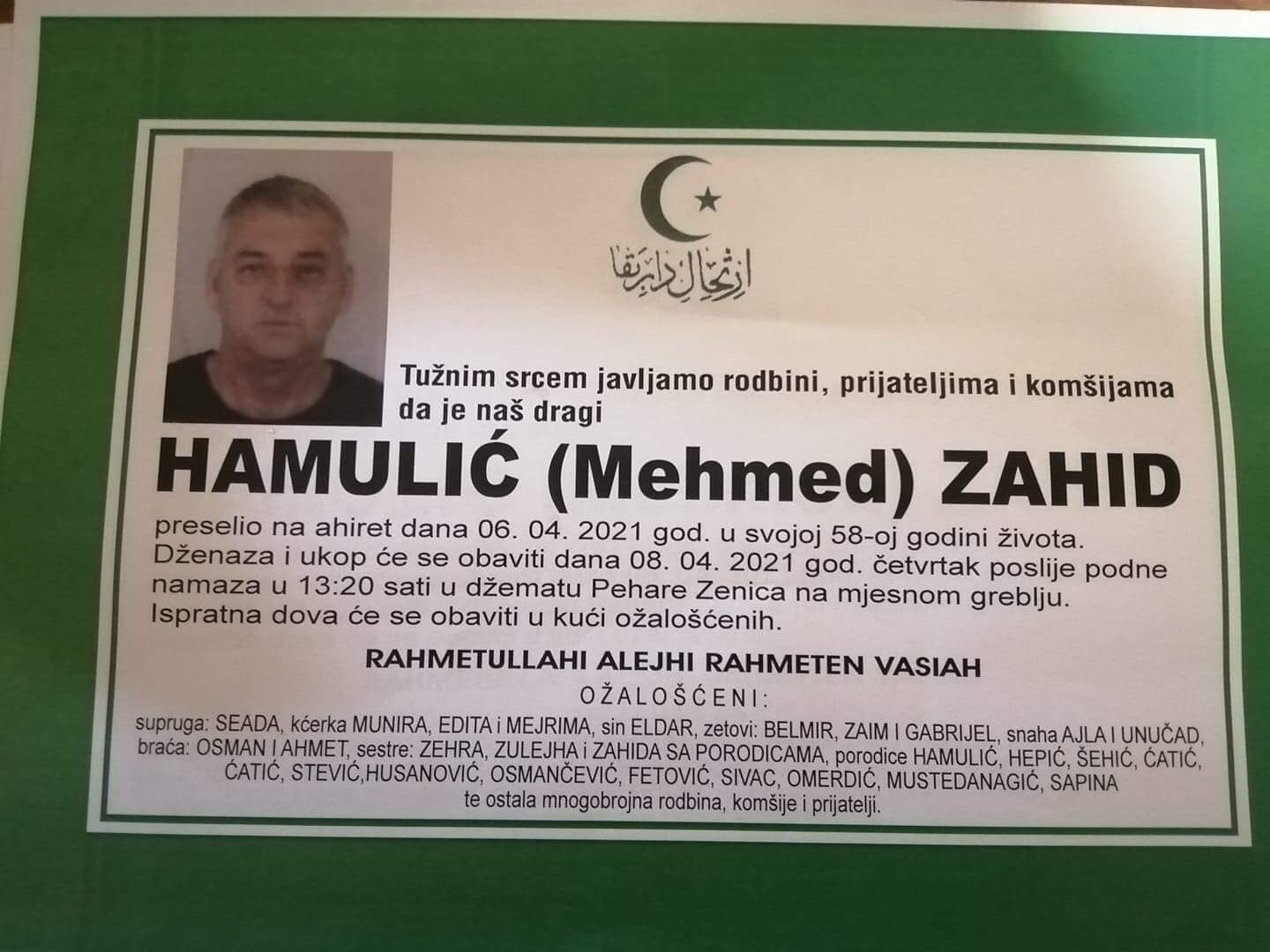 Tužnog srca i s bolom u duši obavještavamo rodbinu, komšije i prijatelje da je naš dragi Hamulić (Mehmed) Zahid, 06.04.2021. godine, u 58. godini života preselio na Ahiret.