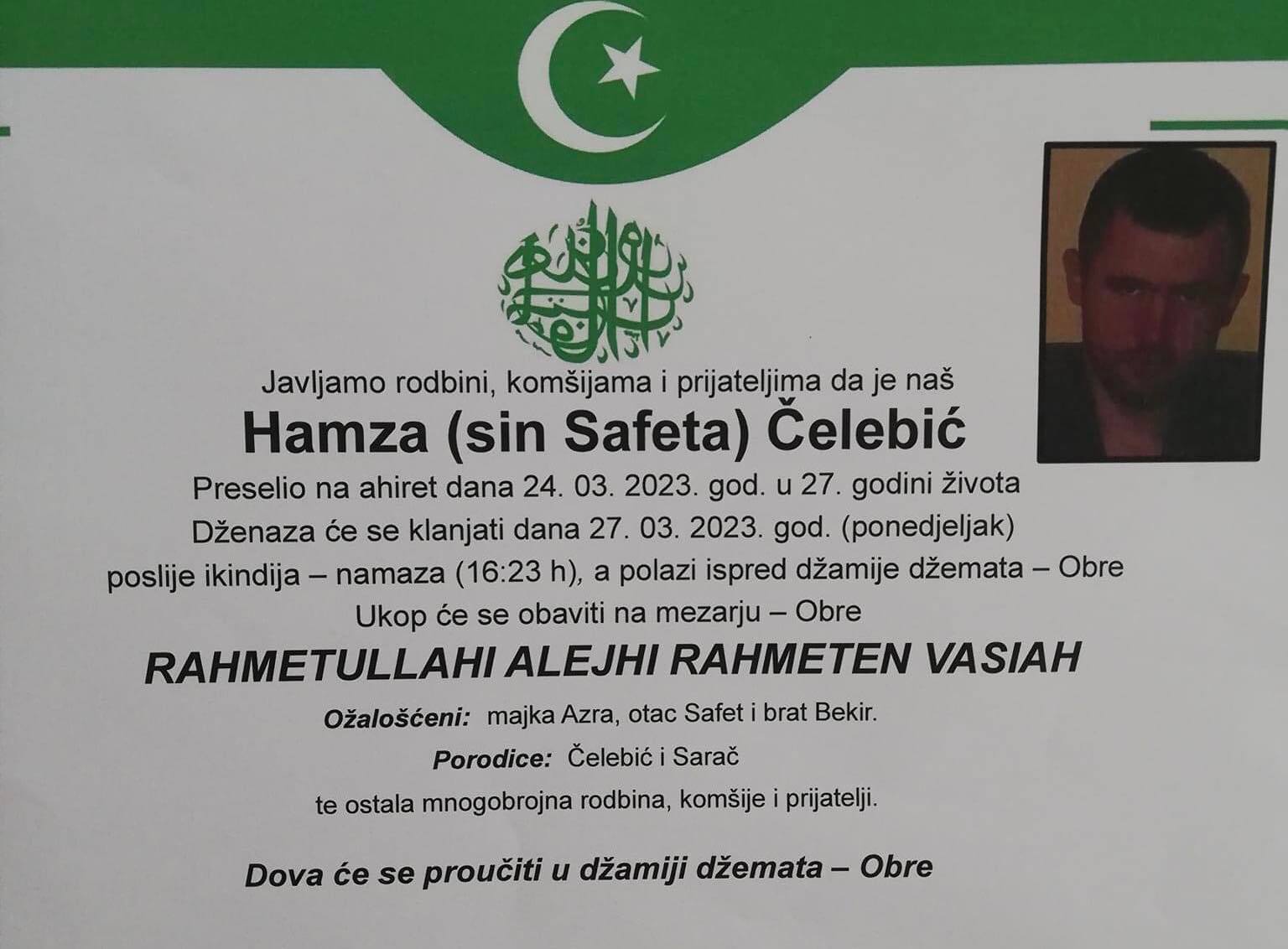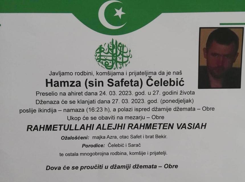 Tužnim srcem javljamo rodbini, prijateljima i komšijama žalosnu vijest da je naš dragi Hamza (sin Safeta) Čelebić dana 24.03.2023. godine u 27-oj godini života preselio na Ahiret.