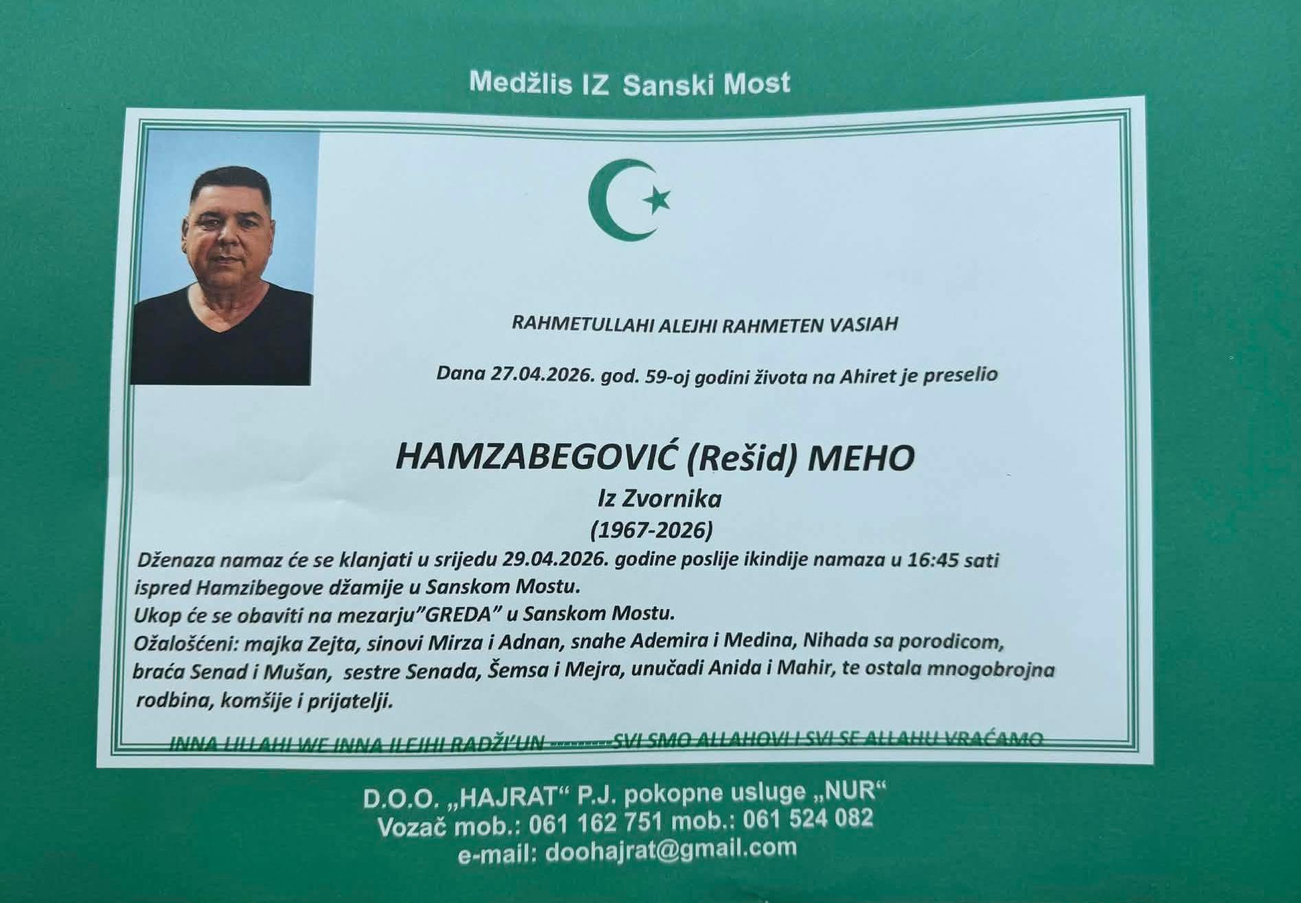 Dženaza namaz će se klanjati u srijedu 29.04.2026. godine poslije ikindije namaza u 16:45 sati ispred Hamzibegove džamije u Sanskom Mostu.