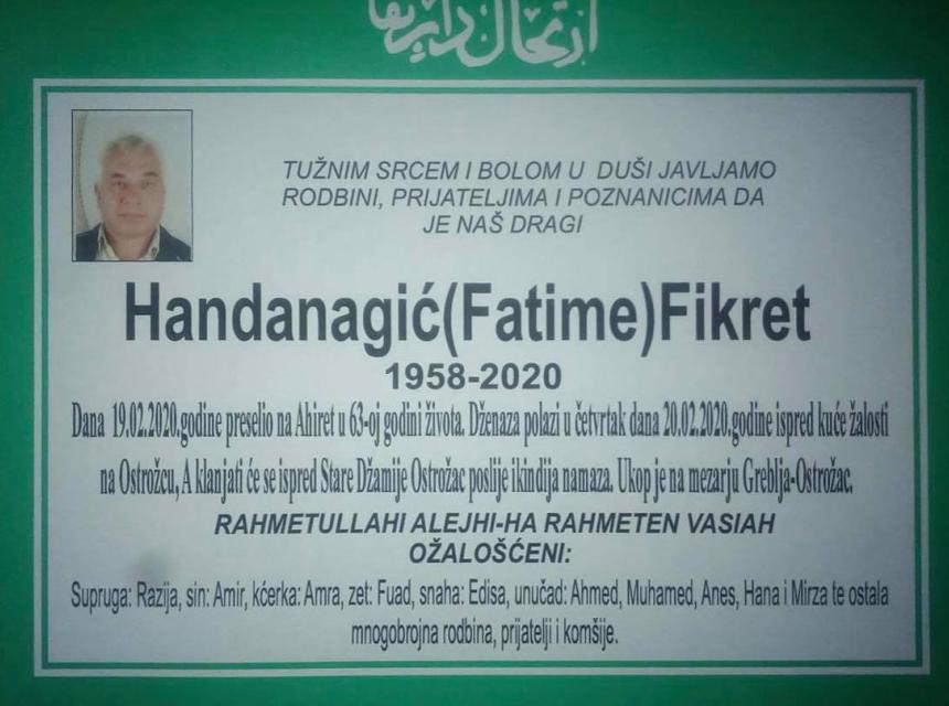 Tužnog srca, s bolom u duši obavještavamo rodbinu, komšije i prijatelje da je naš dragi Handanagić (Fatime) Fikret, dana 19.02.2020.godine preselio na Ahiret u 63. godini života.