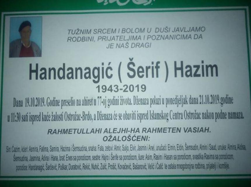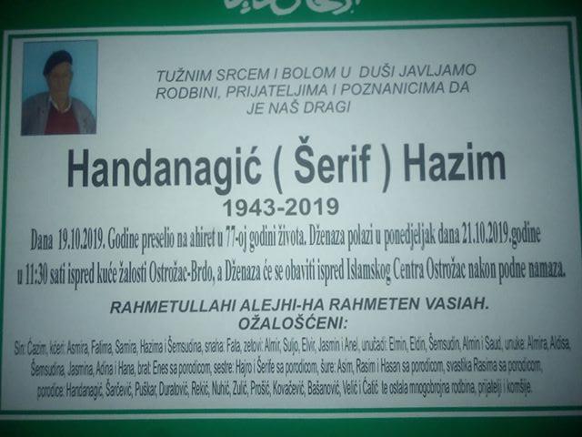 Tužnim srcem i bolom u duši javljamo rodbini, prijateljima i poznanicima da je naš dragi Handanagić (Šerif) Hazim dana 19.10.2019. godine na Ahiret preselio 71-oj godini života.