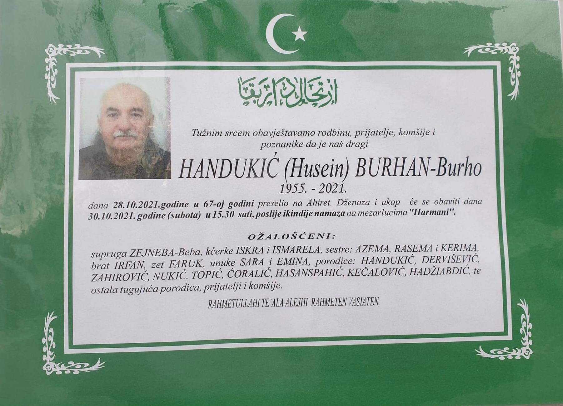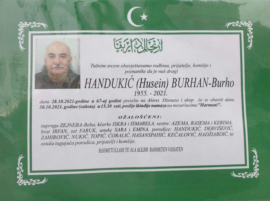 Tužnog srca i s bolom u duši obavještavamo rodbinu, komšije i prijatelje da je naš dragi Handukić (Husein) Burhan- Burho dana 28.10.2021. u 67. godini života preselio na ahiret.