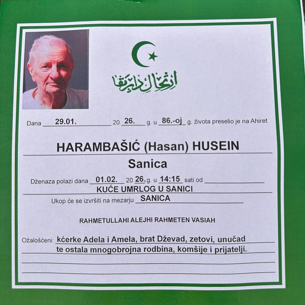Dženaza polazi dana 01.02.2026. g. u 14:15 sati od KUĆE UMRLOG U SANICI.