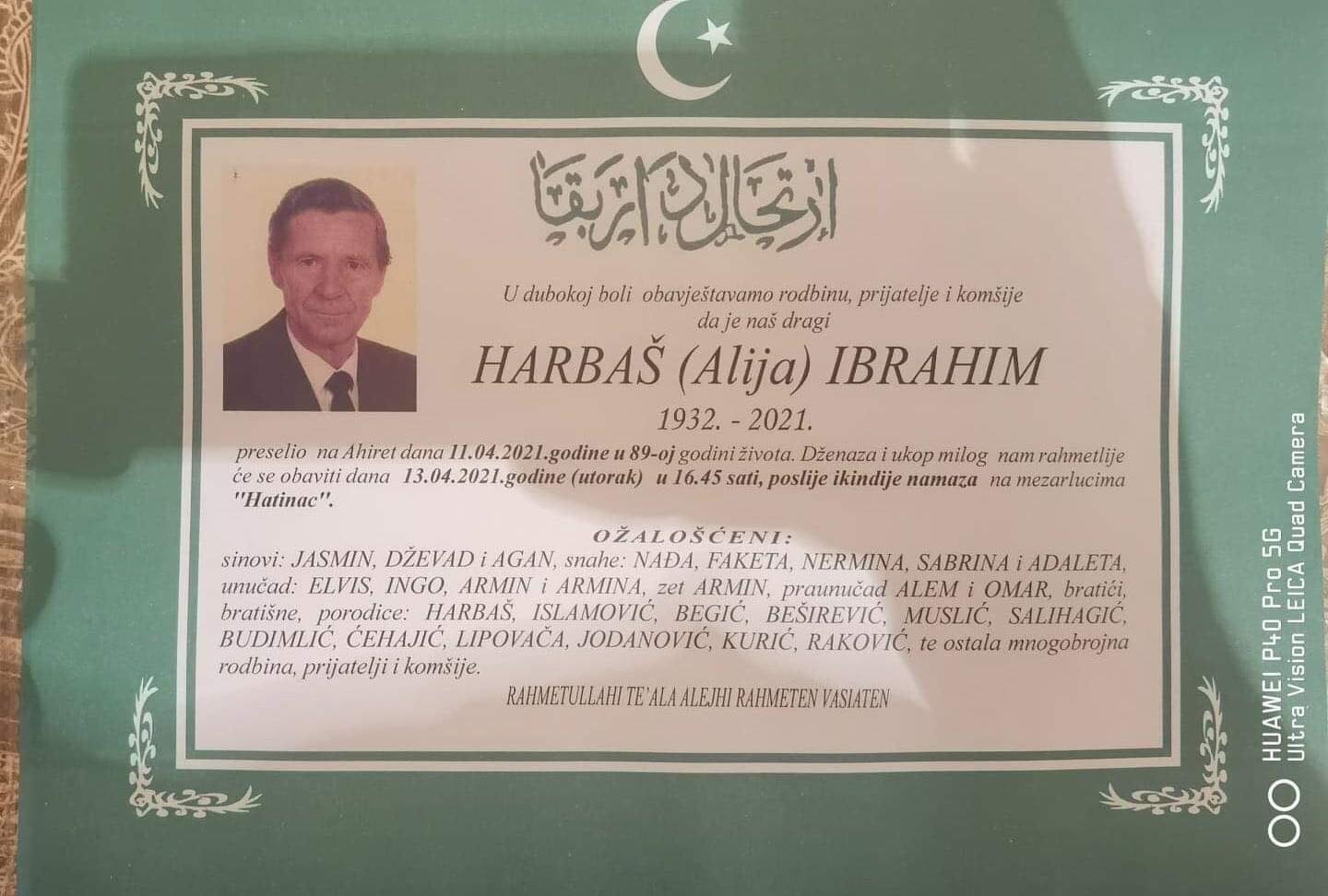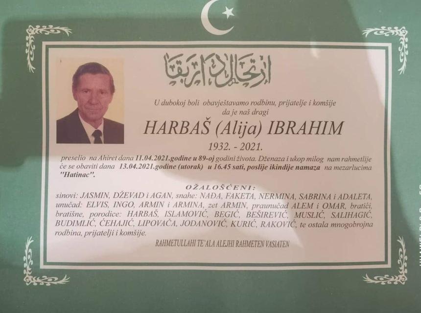 Tužnog srca i s bolom u duši obavještavamo rodbinu, komšije i prijatelje da je naš dragi Harbaš (Alija) Ibrahim dana 11.04.2021 godine, u 89-oj godini života, preselio na Ahiret.