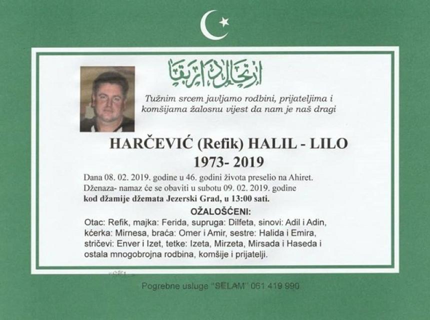 Tužnim srcem javljamo rodbini, prijateljima, komšijama i poznanicima žalosnu vijest da je 08.02.2019. godine u 46-oj godini života na Ahiret preselio Harčević (Refik) Halil - Lilo.