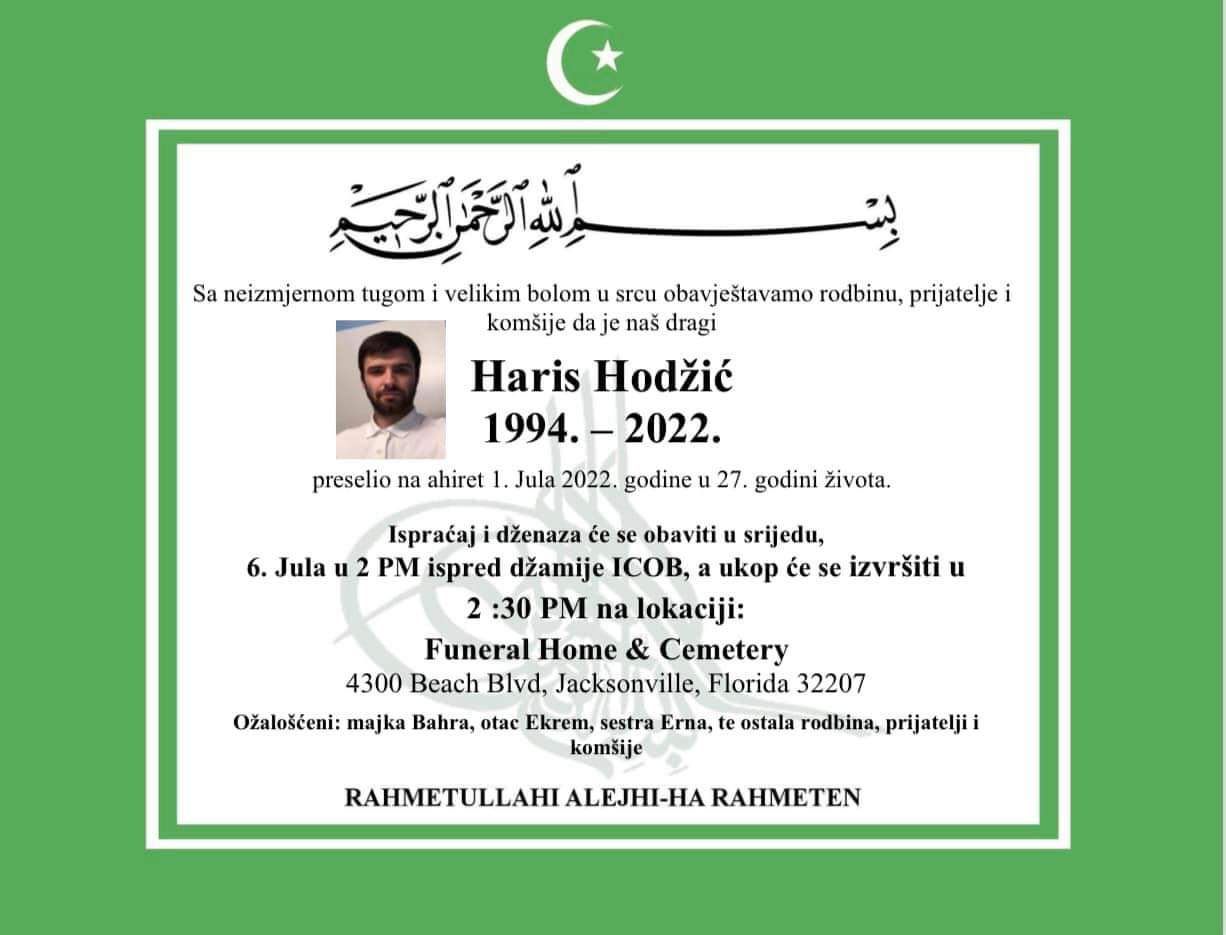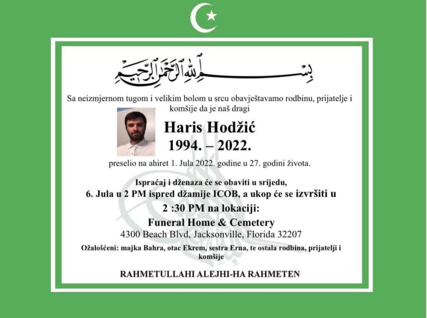 Tužnog srca i s bolom u duši obavještavamo rodbinu, komšije i prijatelje da je naš dragi Haris Hodžić u 27. godini života preselio na Ahiret.