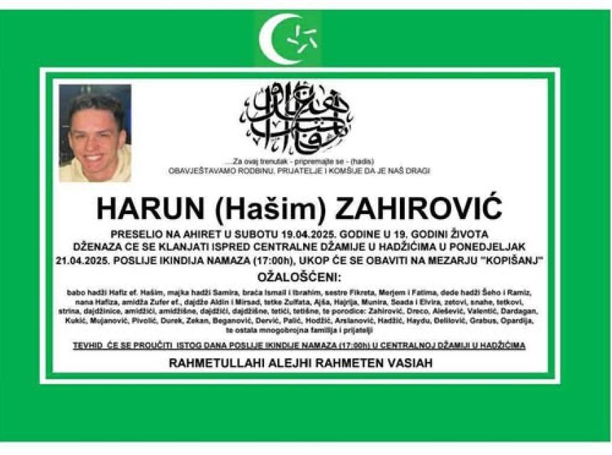 Preselio na ahiret u subotu 19.04.2025. godine u 19-oj godini života.