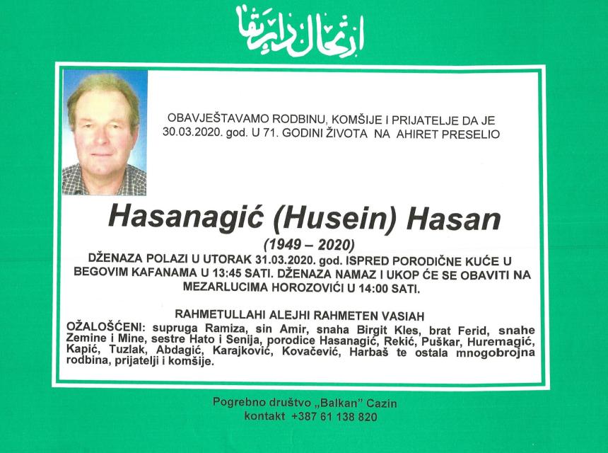 Teškim srcem i bolom u duši javljamo da je naš dragi i nikad prežaljeni Hasanagić (Husein) Hasan dana 30.03.2020.godine u 71-oj godini života preselio na Ahiret.