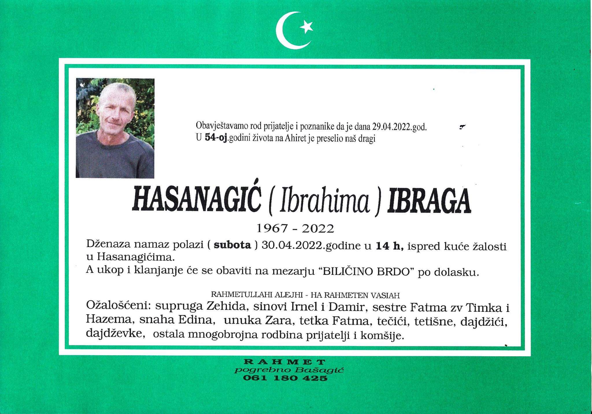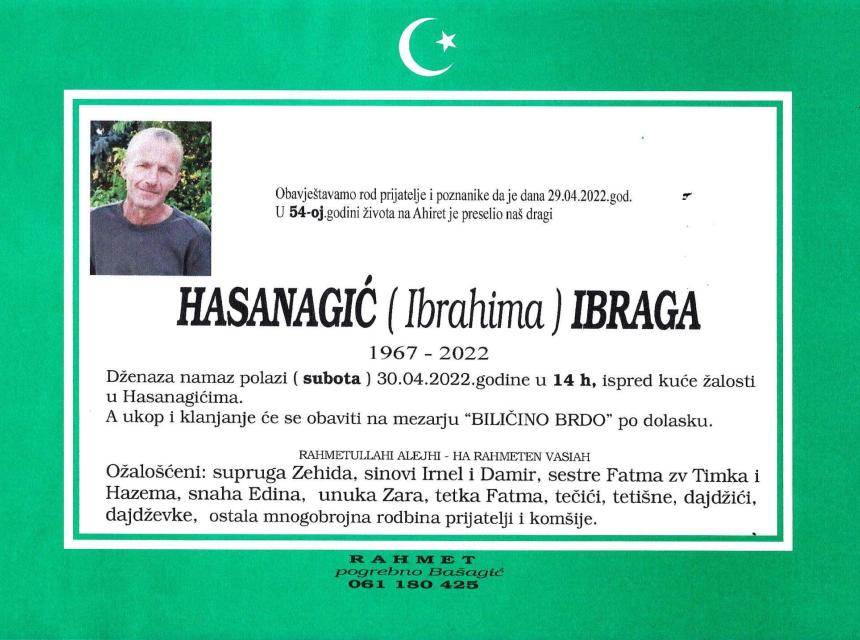 Tužnog srca i s bolom u duši obavještavamo rodbinu, komšije i prijatelje da je naš dragi Hasanagić (Ibrahima) Ibraga u 54. godini života preselio na Ahiret.
