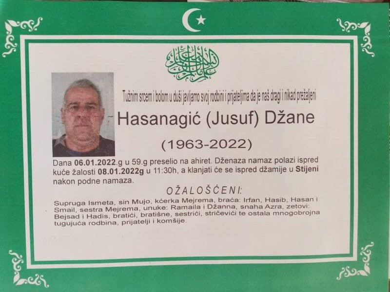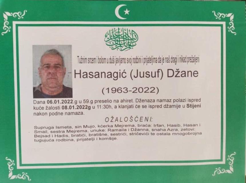 Tužnim srcem i s bolom u duši vas obavještavamo da je naš dragi Hasanagić (Jusuf) Džane, dana 06.01.2021. godine, u 59-oj godini života, preselio na Ahiret.