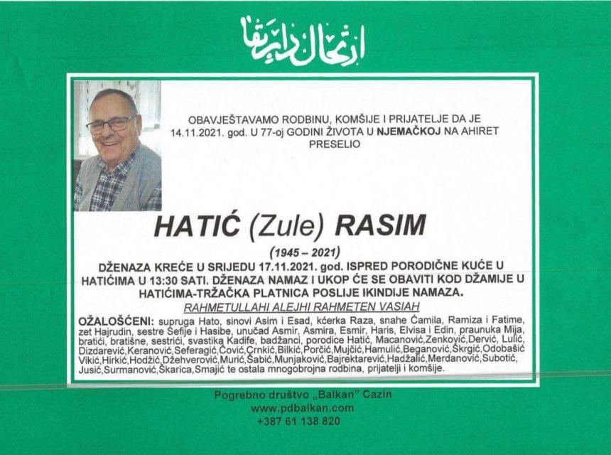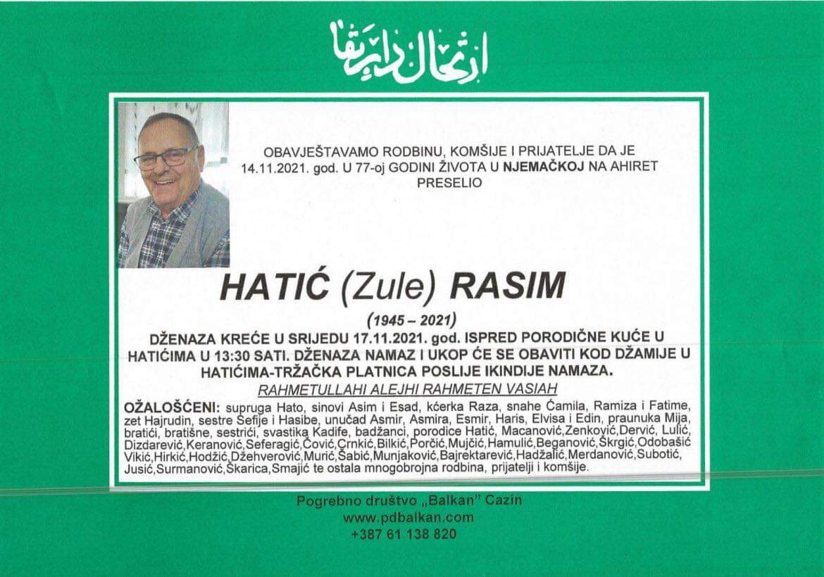 Tužnog srca i s bolom u duši obavještavamo rodbinu, komšije i prijatelje da je naš dragi Hatić (Zule) Rasim dana 14.11.2021. u 77. godini života preselio na ahiret.